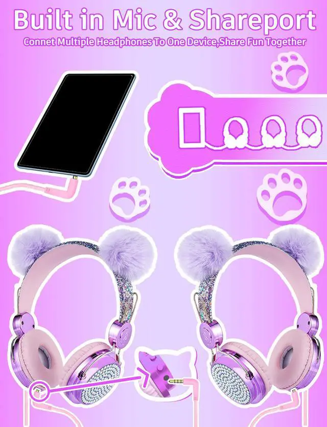 charlxee Kids Pom Headphones with Mic for Travel/Car/Plane,Added 85DB Limit Function&Shareport,Unicorns Gifts for Girls,On/Over Ear HD Stereo Wired Headsets with Nylon Cable-Hot-Purple