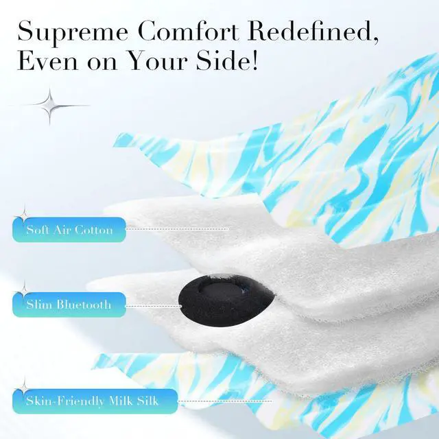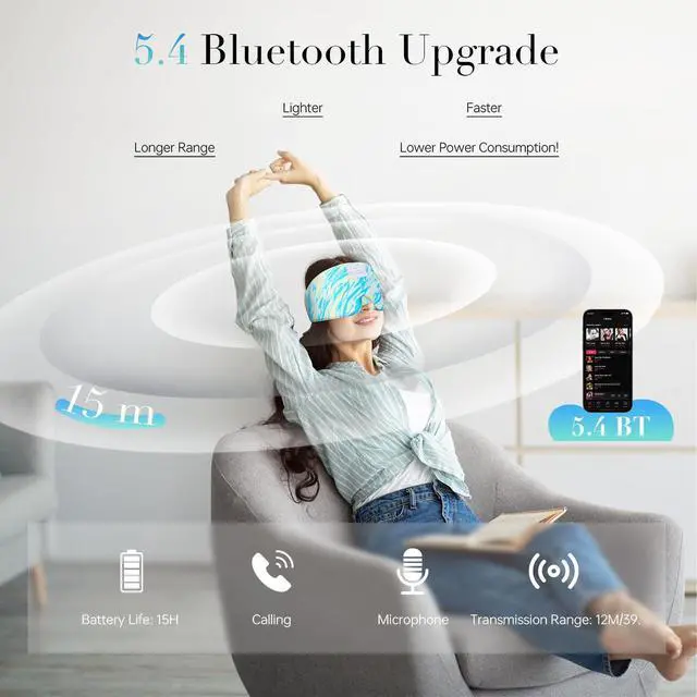 5.4 Enhanced Bluetooth Connectivity:Upgraded Bluetooth 5.4 technology provides a wider connection range of up to 15 meters, ensuring smoother playback and an extended battery life of up to 15 hours. This eye makes with bluetooth headphones ideal for Bluetooth calls and listening to sleep music. Additionally, we've made the speakers thinner for a more comfortable experience, especially for side sleepers
