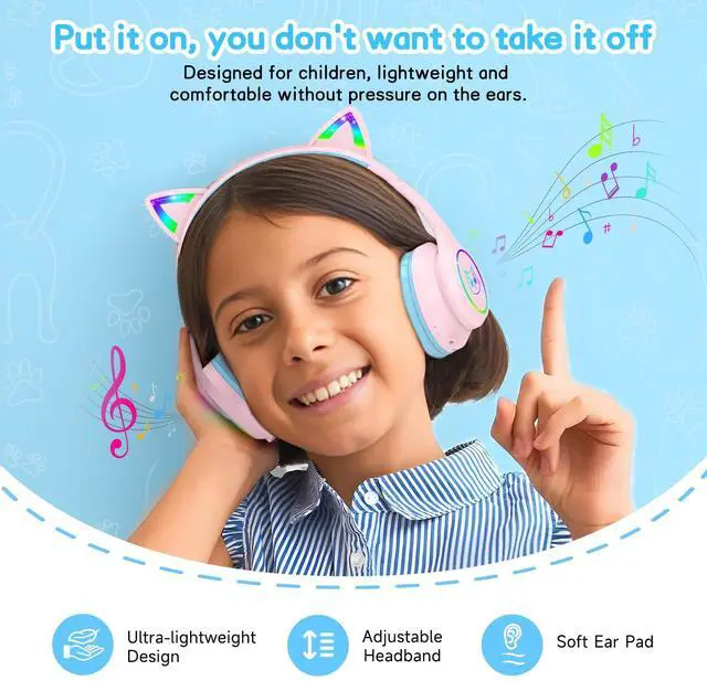• [(Cool Lighting)] Our kids bluetooth headphones comes with RBG cat ear colorful LED lighting, can be freely double-click the button to control on and off, cool lighting can not only arouse kids curiosity, but also make the kids no longer lonely at night, bring unique music enjoyment to kids.