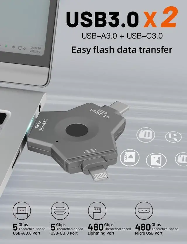 USB 3.0 Fingerprint encryption Flash Drive 4 in 1 OTG Memory Stick with Keychain Dual Thumb Photo Stick Jump Drive for Android/Smartphone/Computers/MacBook/Tablets/PC