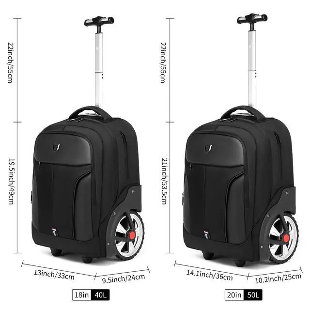 Our wheeled backpack equipped with adjustable shoulder straps, ergonomic and comfortable. Thickly padded back panel adds support while using as a carry on travel backpack ^^ [Large Capacity Space] Large rolling backpack size is 21 x 14.1 x 10.2 inches( 53.5 *36*25cm). The Padded laptop compartment with Velcro sleeve -16 x 10.2 x 1.2 Inches holds up to 17 inch laptop, as well as 15 Inch 14 Inch and 13 Inch laptop. Large main compartment roomy have 50L, hold books, clothes, documents and folders. And other multi-pocket organizer with key fob provide more storage for smaller items, ideal gift laptop rolling backpack, wheeled laptop backpack ^^ [Stronger Shoulder Strap and Handles] Wheeled backpack's shoulder straps and handles have been reinforced to become very firm, soft sponge cushion, more comfort and more load bearing.
