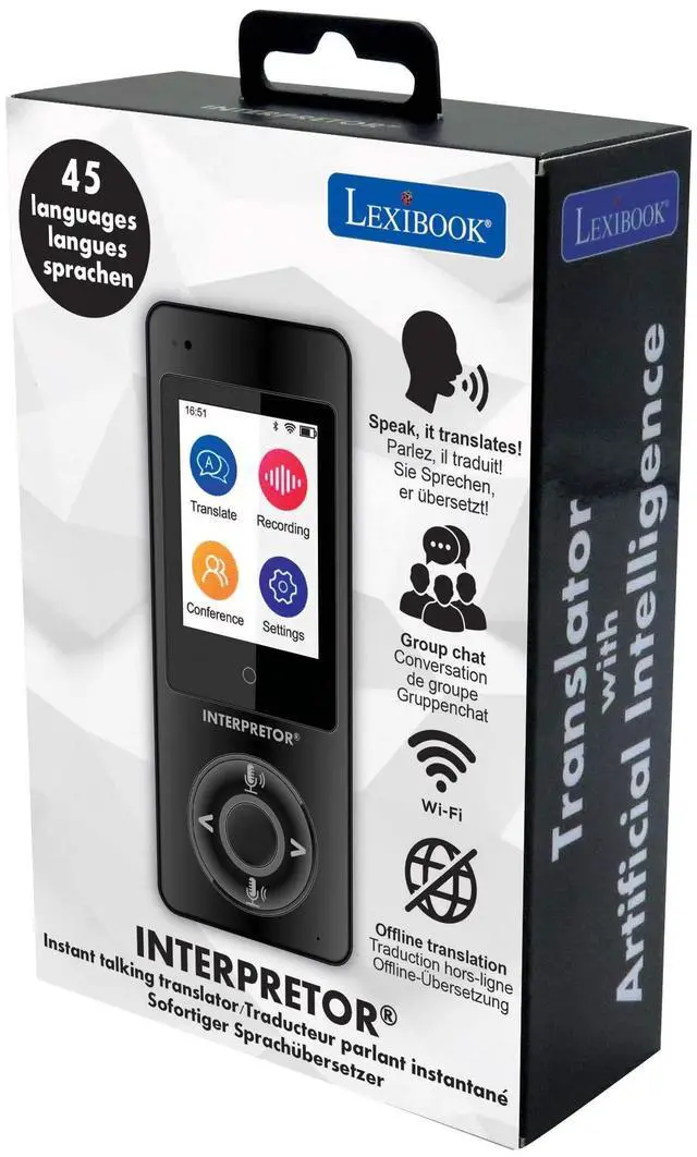 Offline translation for unrestricted use in 7 languages: French, English, German, Italian, Spanish, Portuguese and Chinese! Dictaphone function with the ability to transfer voice notes to a computer Transcribes all translations instantly in writing and orally in both languages Neck strap included to carry it everywhere in travel, meetings Built-in rechargeable battery (USB cable included): up to 10h of continuous use, 7 to 10 days in standby mode!