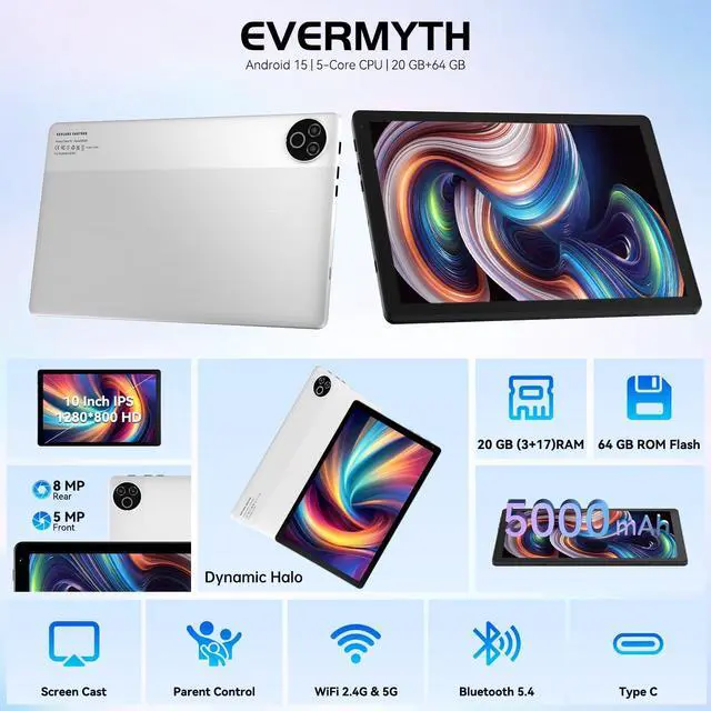 This ensures quick app launches and smooth gameplay. ^^ 10-Inch IPS In-Cell DisplayThis tablet PC boasts a 1280800 high-resolution IPS screen that delivers vibrant, true-to-life colors. Enjoy sharper, brighter visuals for a more immersive viewing experience. The 5MP front and 8MP rear camera can handle video calls and photo recording with ease. LCD touchscreen uses low-blue-light tech to cut down on eye strain from screen flicker and harsh blue light. Slim and lightweight, this 10-inch tablet amps up immersion for all your favorite activities. ^^ 5000mAh Rechargeable BatteryPacked with a 5000mAh battery and a low-power-consuming CPU, Evermyth tablet offers up to 3 days of standby time and up to 5 hours of mixed usageperfect for reading, streaming, or web browsing.
