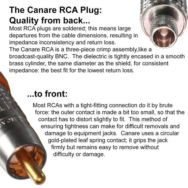 SDI coax: cable thats been designed to carry digital signals of almost any practical bandwidth, well in excess of the practical requirements of S/PDIF. The most important characteristic in a coaxial digital audio cable is impedance stability, which translates to lower return loss. In order to keep the tight impedance of the SDI coax as consistent as possible from end to end, we use Canare connectors. These are a three-piece crimp design in which the impedance of the cable is carried well into the connector rear by having the exposed dielectric run inside a brass tube the size of the cables shield. Consistent dimensions means consistent capacitance and inductance, which mean consistent impedance. The Canare RCA also guarantees a perfect fit to the RCA jack the ground contact grips the jack with a 360 degree leaf spring arrangement, giving firm, definite engagement but also ensuring that the plug can be easily removed from the jack without damage. Our digital audio cables are assembled in our shop in Seattle, Washington by experienced workers.