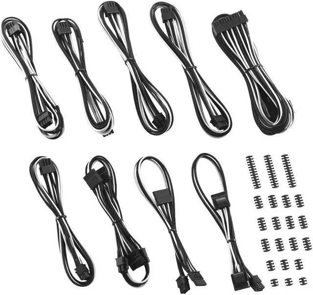 Here's what you get inside the box: 1 x 24 Pin ATX (600mm) 1 x 8 Pin EPS (700mm) 1 x 4+4 Pin EPS (700mm) 2 x 8 Pin PCI-e (600mm) 1 x 6 Pin PCI-e (600mm) 1 x Quad SATA Power (850mm) 1 x Dual SATA Power (500mm) 1 x Dual Molex (500mm) 3 x 24 Pin Cable Combs (Black) 12 x 8 Pin Cable Combs (Black) 3 x 6 Pin Cable Combs (Black) 3 x 4 Pin Cable Combs (Black)