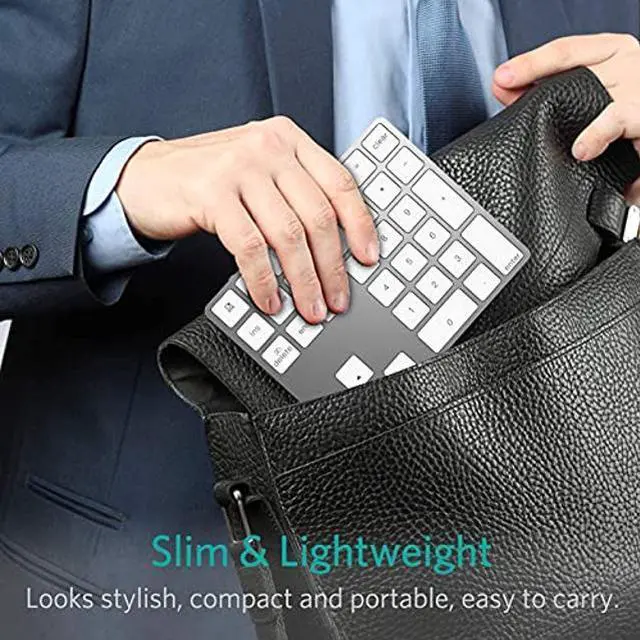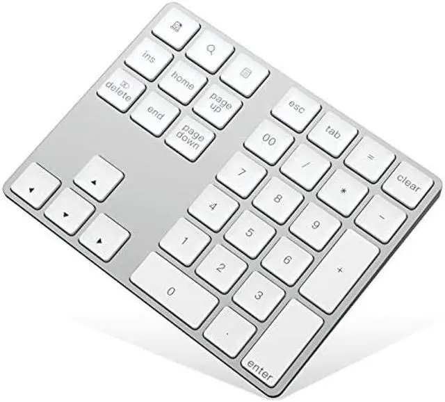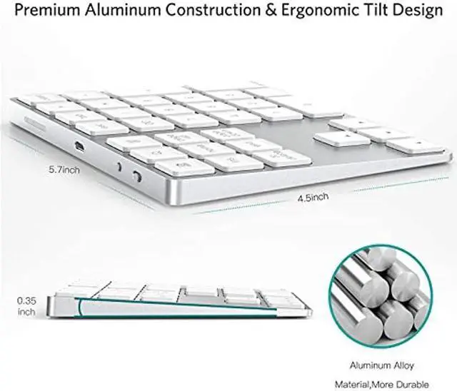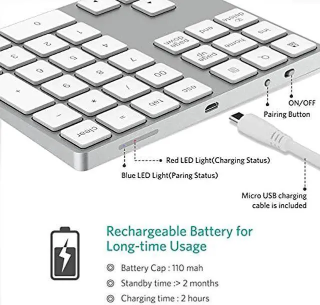 The numeric keypad, a cool extra accessory for your Apple Wireless Keyboard, 34 function keys, fast bluetooth pairing, 6 degrees ergonomic tilt design, built-in rechargeable lithium batteries.