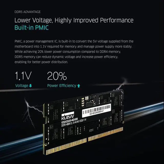 Bandwidth Efficiency: KLEVV DDR5 SO-DIMM memory module delivers starting speed at 4800MT/s which leads to faster increase of fundamental frequency. It shows 1.87 times better bandwidth efficiency compared to DDR4 memory. ^^ Lower Voltage, Highly Improved