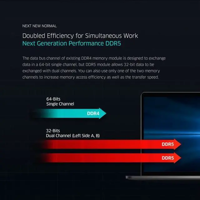 Generation Performance DDR5: The data bus channel of existing DDR4 memory module is designed to exchange data in a 64-bit single channel, but DDR5 module allows 32-bit data to be exchanged with dual channels. You can also use only one of the two memory channels to increase memory access efficiency as well as the transfer speed. ^^ Fixing Issue from the Chip Itself Improving Stability through