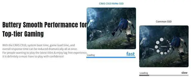 Phenomenal Speed for Both Work and Fun Time to take your system performance to new heights! Leveraging PCIe Gen 4 technology, the CRAS C910 achieves phenomenal read/write speeds of up to 5000/4800MB/s, delivering seamless experience for gamers, creators, and professionals. ^^ Modern yet Powerful Aluminum Heatsink The attachable aluminum heatsink of CRAS C910 provides an efficient way to dissipate unnecessary heat from the product. With up to 10% temperature reduction compared to non-heatsink SSDs, it can avert overheating and secure long-term reliability to extend product lifespan. ^^ Buttery Smooth Performance for Top-tier Gaming With the CRAS C910, system boot time, game load time, and overall response time can be reduced dramatically all at once.