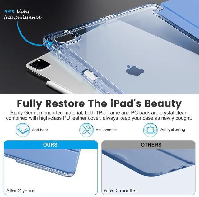 • We are the UNIQUE forerunner to apply the most advanced HD transparent tech to produce this iPad Pro 12.9 case cover. Different from those cheap semitransparent or frosted cases in the market, this HD clear case will deliver the real beauty of your iPad and display the apple icon clearly without any fuzzy. [ DON'T FORGET to peel off the protective films from inside and outside on the back before using it. ]