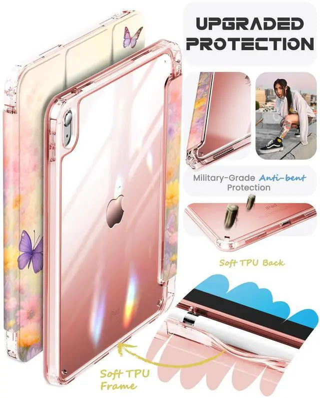 INFILAND Compatible with iPad A16 Case 11th Generation 11 Inch 2025, iPad 10th Generation Case 10.9 Inch 2022, Clear Slim Protective Cover with Apple Pencil Holder & Charging Adapter (Blossom Meadow)