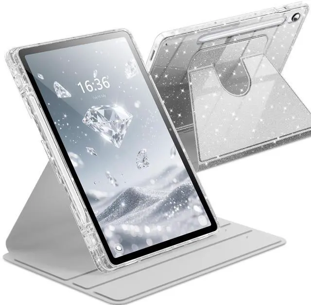 INFILAND Rotating Case for Samsung Galaxy Tab S10 Lite/ S10 FE/ S9 FE 5G 10.9 Inch/Tab S9 11 Inch 360 Cute Glitter Cover with Clear Back, S Pen Holder for Girls, Kids, Woman (Silver)