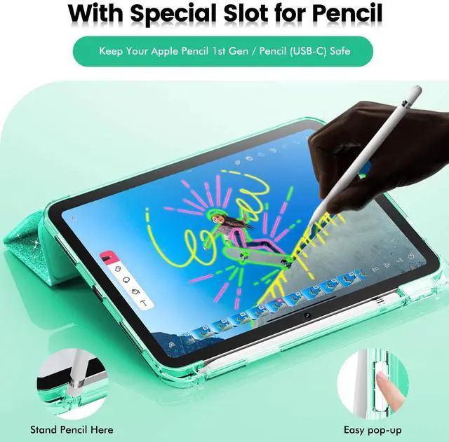 Pencil: Built in Apple Pencil Holder of this iPad 10th Generation Case on the right side for safe storage, so you will no longer worry about the pencil get lost easily. This will bring a lot of convenience for you to use the pencil anytime anywhere. ^^ All-around Protection & Precise hole position: The applied soft TPU frame of this apple iPad a16 case made it super easy to install/remove but not hurt your device. Raised Cutout for Camera & screen for better protection against accidental scratches. Precise hole position makes you easy access to headphone, charging and microphone as well as Touch ID.