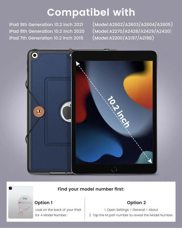 • Specifically designed for iPad 10.2 inch:This keyboard case is specifically designed for iPad 10.2 9th Gen 2021 (Model Number: A2602, A2603, A2604, A2605)/8th Gen 2020 (Model Number: A2270, A2428, A2429, A2430)/7th Gen 2019 (Model Number: A2197, A2200, A2198). Not for iPad Pro 10.5 2017/not for iPad Air 3 Gen 10.5 2019 and other models.Please make sure your tablet model is correct before purchasing