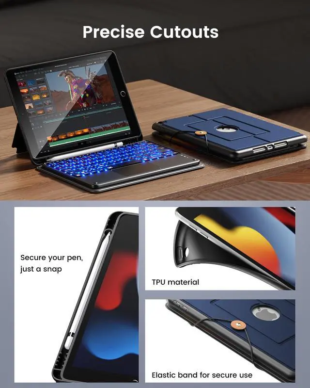 INFILAND Keyboard Case for iPad 9th/8th/7th Generation 10.2 Inch, 7-Color Backlight & High Precision Trackpad, Slim Detachable Folder Style Keyboard Case with Pencil Holder (04-Navy)