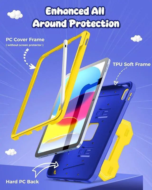^^ Robust Defense Design: The iPad 10th/11th generation case combines tough PC back, enhanced shock-absorbing TPU outer shell and soft inner frame. This dual-layer construction shields your iPad 10th/11th gen from scratches, accidental falls, knocks, and impacts with military-grade reliability. ^^