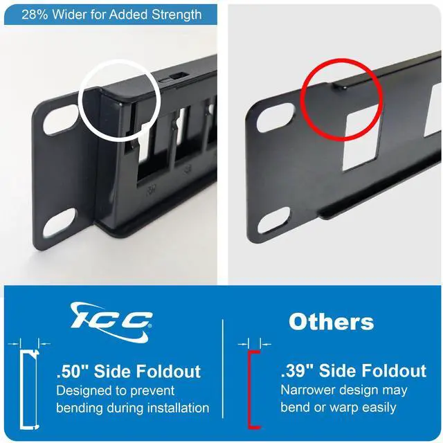The ICC 24-Port Blank Keystone 1U Patch Panel offers a durable and efficient solution for high-density network installations, featuring a 19 reinforced steel rackmount frame with a black powder-coated finish for long-term reliability. Designed for flush mounting, it reduces cable snags and maintains a clean, professional appearance. This modular panel supports slim-profile keystone jacks (sold separately) for data, voice, audio, and video applications, including CAT6A, CAT6, CAT5e, HDMI, RCA, USB, and F-Type. It fits standard 19 racks with pre-drilled holes and includes #12-24 x 5/8 pilot screws for quick installation.