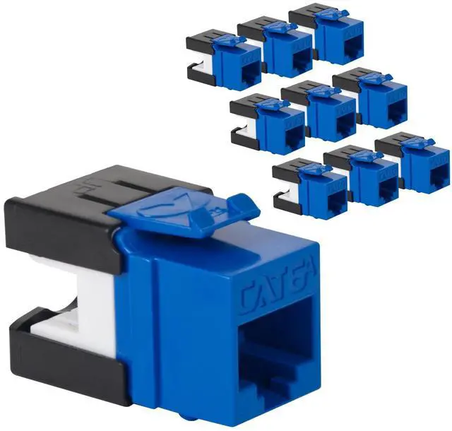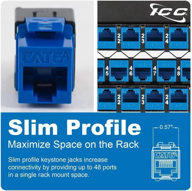 ICC CAT6A Keystone Jack with Slim Profile 180 Degree Punch Down, 10Gbps RJ45 UL Listed PoE++ TAA Compliant for Wall Plate or Patch Panel, Works with JackEasy Termination Tool, Blue 10 Pack