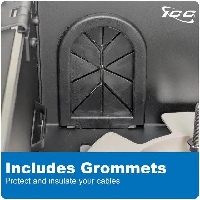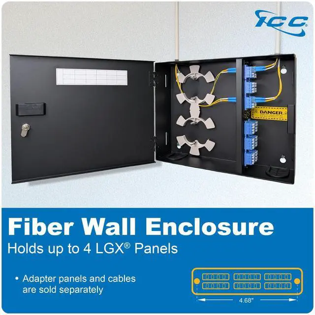 The ICC Fiber Optic Wall Mount Enclosure with four LGX-compatible slots provides a secure and compact solution for distributing up to 96 LC, 48 SC, or 24 ST fiber connections in indoor environments where rack space is limited. Built from 18-gauge cold-rolled steel with a black powder-coated finish, this enclosure is designed for wall mounting in telecom closets, remote zones, and building entry points. It features a lockable swing-out door with dual keys for added security and a pre-installed wiring label for easy port identification. Cable entry points at the top and bottom include pre-installed rubber grommets to protect fibers and reduce dust.