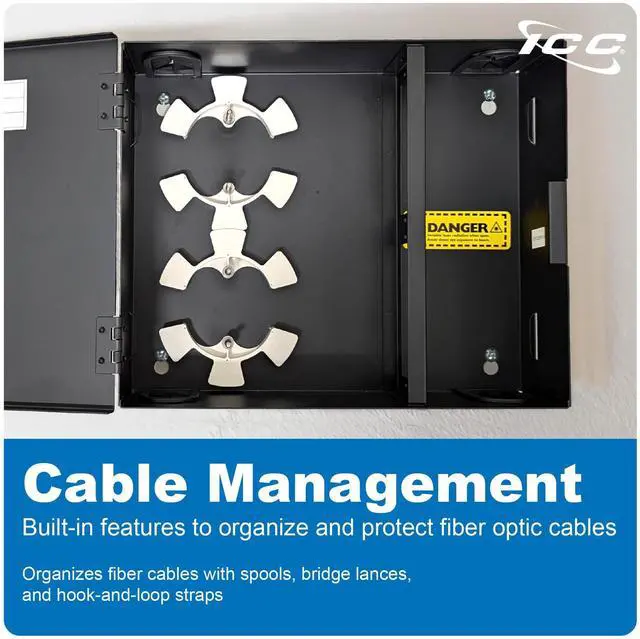 The enclosure includes built-in cable management spools and bridge lances to keep fiber organized and strain-free. It supports up to three 12-fiber splice trays (sold separately) and meets or exceeds TIA-568-C. 3 standards for structured cabling installations.