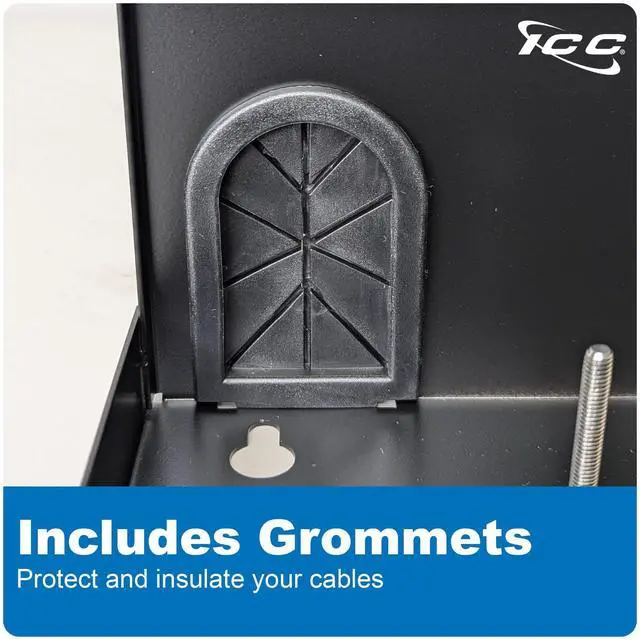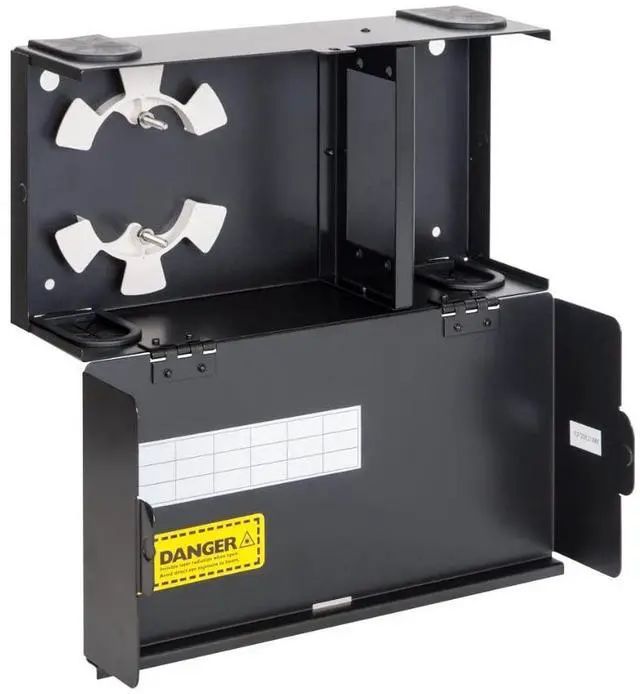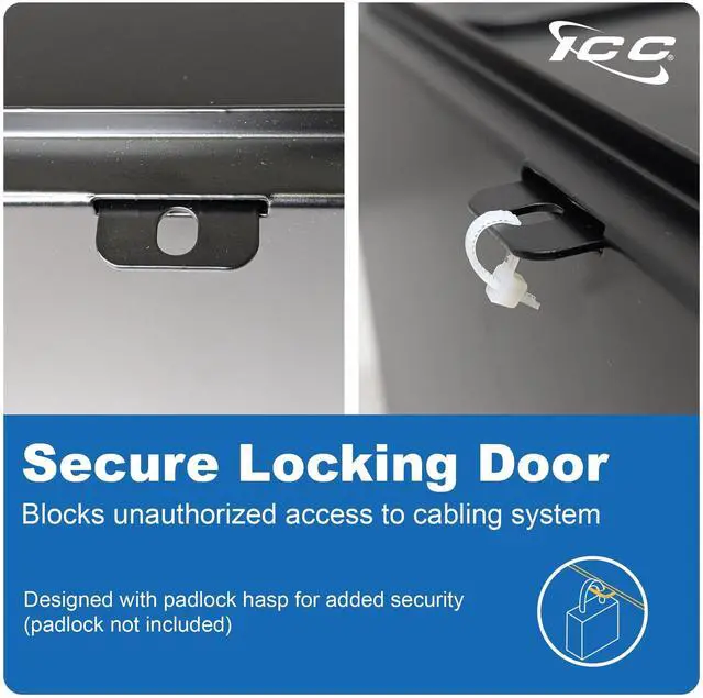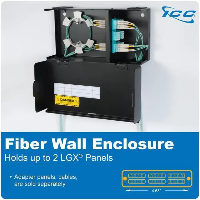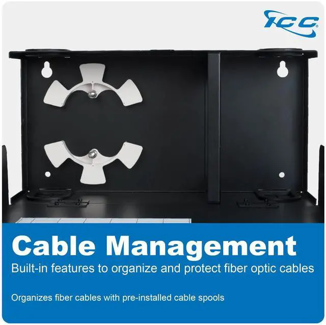 The ICC Fiber Optic Wall Mount Enclosure is a compact fiber distribution solution designed to support up to 48 LC, 24 SC, or 12 ST connections in areas where rack space is not available. Built from 18-gauge cold-rolled steel with a black powder-coated finish, the enclosure features a lockable drop-down door for secure fiber access and includes a wiring label for easy system management. It accommodates two LGX-compatible adapter panels or MPO cassettes (sold separately) and holds up to three 12-fiber splice trays. Integrated cable management spools and pre-installed cable grommets at the entry points help protect and organize fiber pathways while reducing dust.