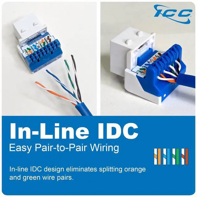 The ICC CAT5e Keystone Jacks are engineered for reliable network performance, meeting and exceeding Category 5e standards. They are designed for easy installation and offer superior connectivity for data networks, making them ideal for both commercial and residential structured cabling solutions. Their backward compatibility ensures that they fit seamlessly into existing network setups, providing a cost-effective solution for network upgrades or expansions.
