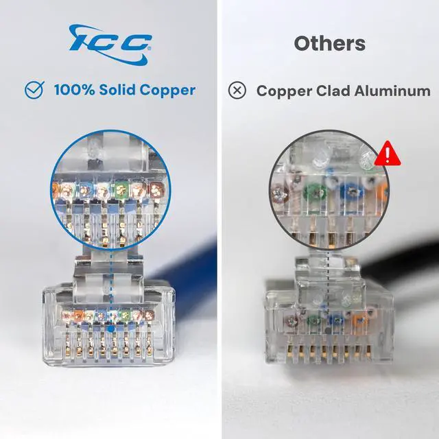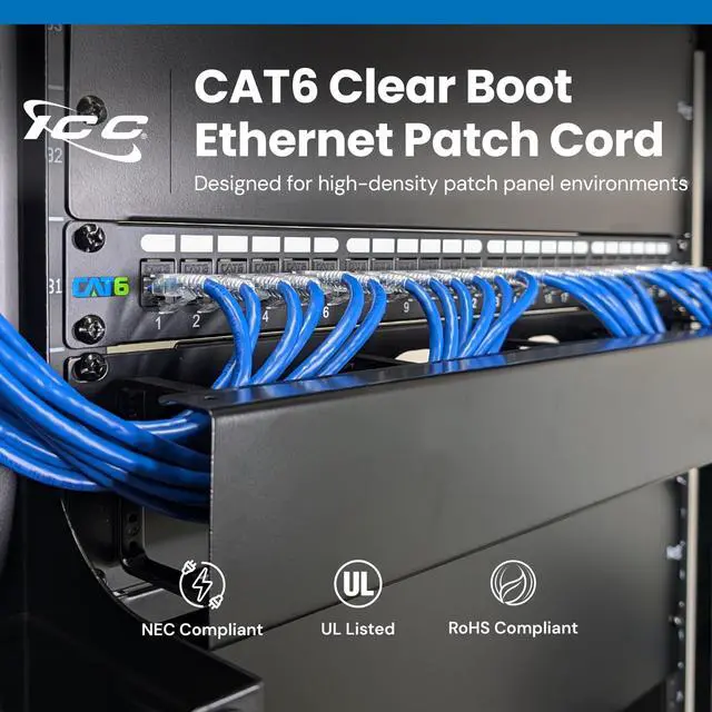 ICCs CAT6 unshielded twisted pair (UTP) patch cords exceed all performance requirements up to 550 MHz. They are ETL verified to ANSI/TIA-568-C. 2 and UL listed. These patch cords are made from low-profile, snag-free boots for high-density applications. They are available in the most popular stock length and in a variety of colors to easily differentiate connection types.