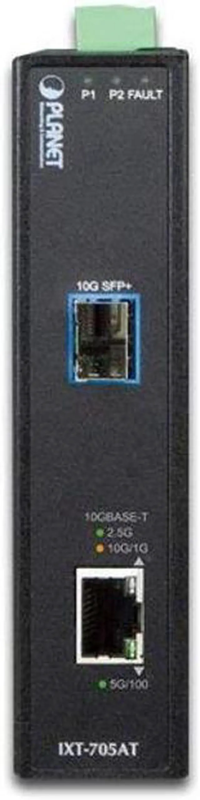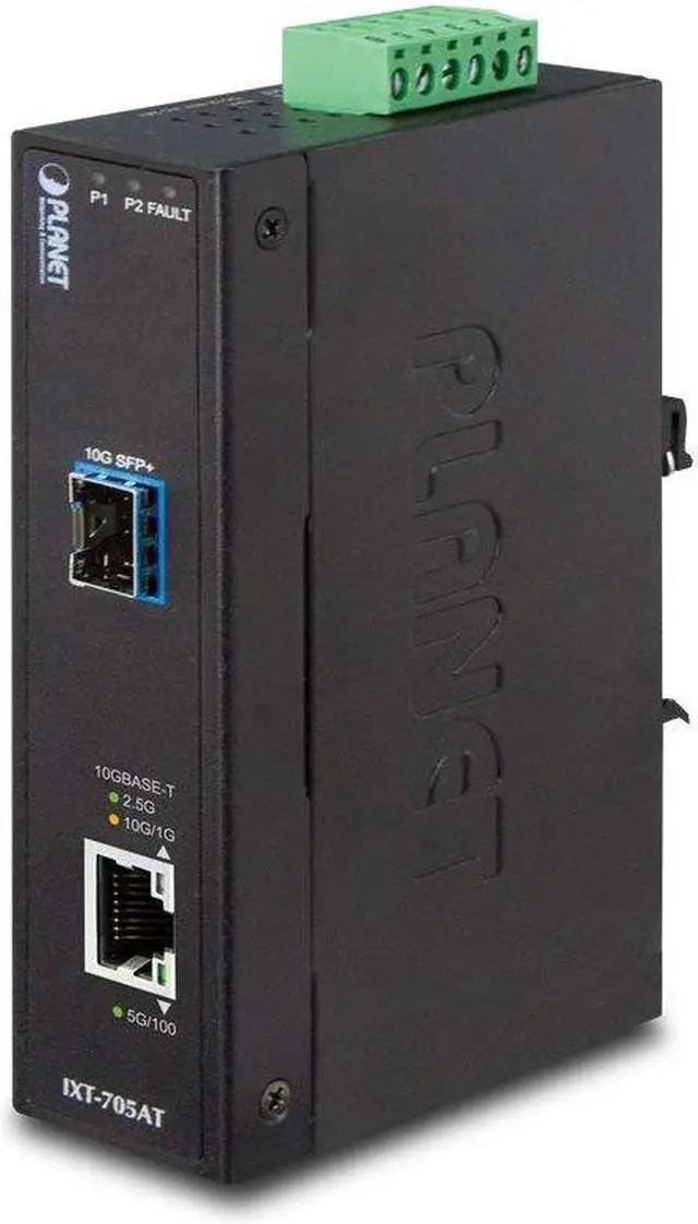 The IXT-705AT is the smallest Industrial-grade 10G Ethernet Media Converter providing non-blocking wire-speed performance and great flexibility for 10 Gigabit Ethernet extension in harsh industrial environments. It is equipped with one 100Mbps, 1Gbps, 2.5G bps, 5Gbps and 10GBASE-T RJ45 copper interface and one 10GBASE-X SFP+ fiber optic interface delivered in an IP30 rugged, compact case with redundant power system. The IXT-705AT is ideal for 10G bandwidth applications from copper to fiber media conversion in climatically demanding environments with wide temperatures ranging from -40 to 75°C.