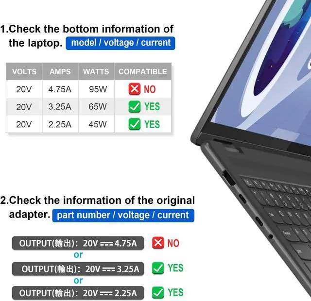 Output Max: 65w ~ 20v 3.25 a Compatible 45W~ 20v 2.25 a/and Less Than 65W