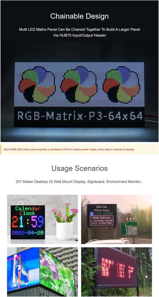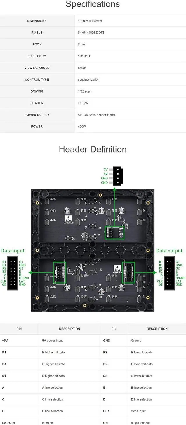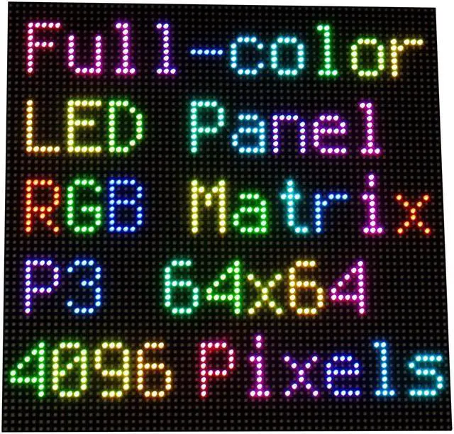 64x64 pixels, 3mm pitch, allows displaying text, colorful image, or animation