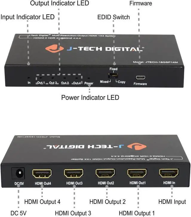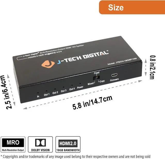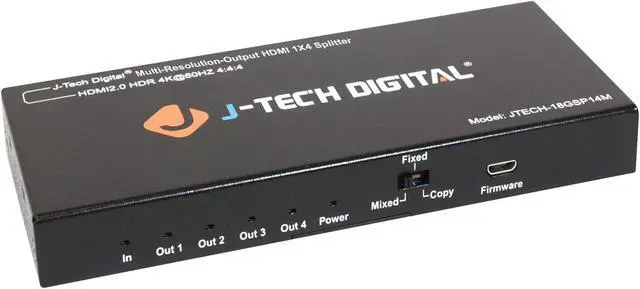 J-Tech Digital is focused on producing high-quality products that integrate and distribute home entertainment for residential and commercial users. J-Tech Digital has played a major role in transforming whole-house audio, video and home theater for consumers worldwide. The JTECH-18GSP14M Splitter is an MRO (Multi-Resolution Output) splitter and can support various resolutions to the outputs. With 3 different EDID settings, you have the option of copying the EDID settings from your display for compatibility assurance, mixing the output resolutions allowing for the combination of 4K and standard definition displays, and a fixed setting to distribute a 4K video signal to 4 displays. This MRO splitter is perfect for users that are gradually upgrading their entertainment centers and need a device that supports 4K and 1080p allowing for the integration of brand new displays while still making use of older and outdated ones. NOTE: the MRO series splitters do not downscale to 720P. They do not change the scan type (Progressive vs Interlaced) and they do not downscale HDR Metadata (HDR/HDR10/DolbyVision) Specifications: Input ports: x1 HDMI