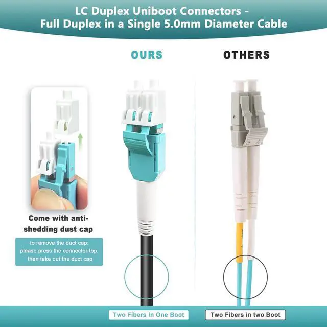 Multimode OM3 Duplex LC Uniboot connector: The uniboot design allows one cable to carry two fibers to reduce the cable bulk when routing. LC Uniboot Connectors also enable simplified polarity correction