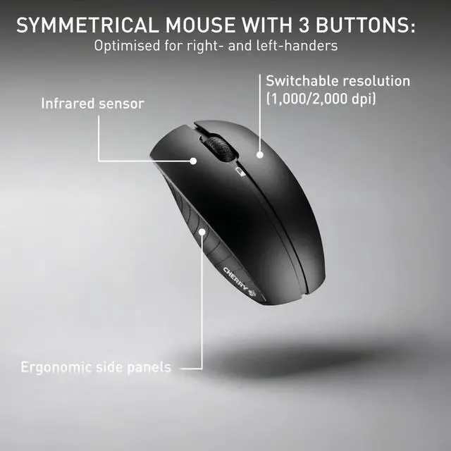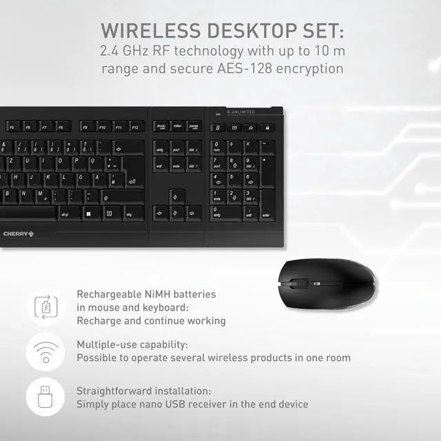 Do you attach great importance to straightforward design, standardized layout and perfect typing feel? Then this Wireless Desktop is just right for you. The CHERRY B. UNLIMITED 3.0 transmits data with 2.4 GHz radio transmission up to 10m away and avoids cable tangle on your desk. The included keyboard for PC, notebook or tablet convinces with its high-quality CHERRY SX scissor mechanism. This technology offers an excellent tactile writing feel with a short keystroke and a long service life (over 10 million keystrokes per key). A built-in metal plate gives the reliable keyboard weight and stability.