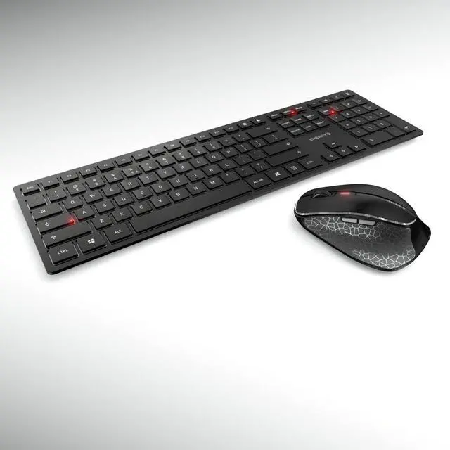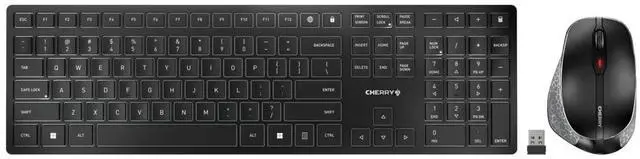 It has rubberized side parts with a rest for your thumb to relax on. The generously sized sliding surfaces allow you to guide the mouse smoothly over the desk without strain on the wrist. ^^ The rechargeable designer desktop for demanding users Two top sellers come together in the CHERRY DW 9500 SLIM. The silver and black CHERRY KW 9100 SLIM wireless keyboard and the ergonomically shaped CHERRY MW 8C ERGO right-handed mouse are a dream team. State-of-the-art technology and top-quality workmanship combine with elegant design to create a genuine eye-catcher on your desk. ^^ Status LEDs show low residual battery charge, charging status and mouse resolution Status LEDs integrated directly in the keys for the CAPS LOCK, NUM and SCROLL keys Extra-small nano receiver for wireless operation