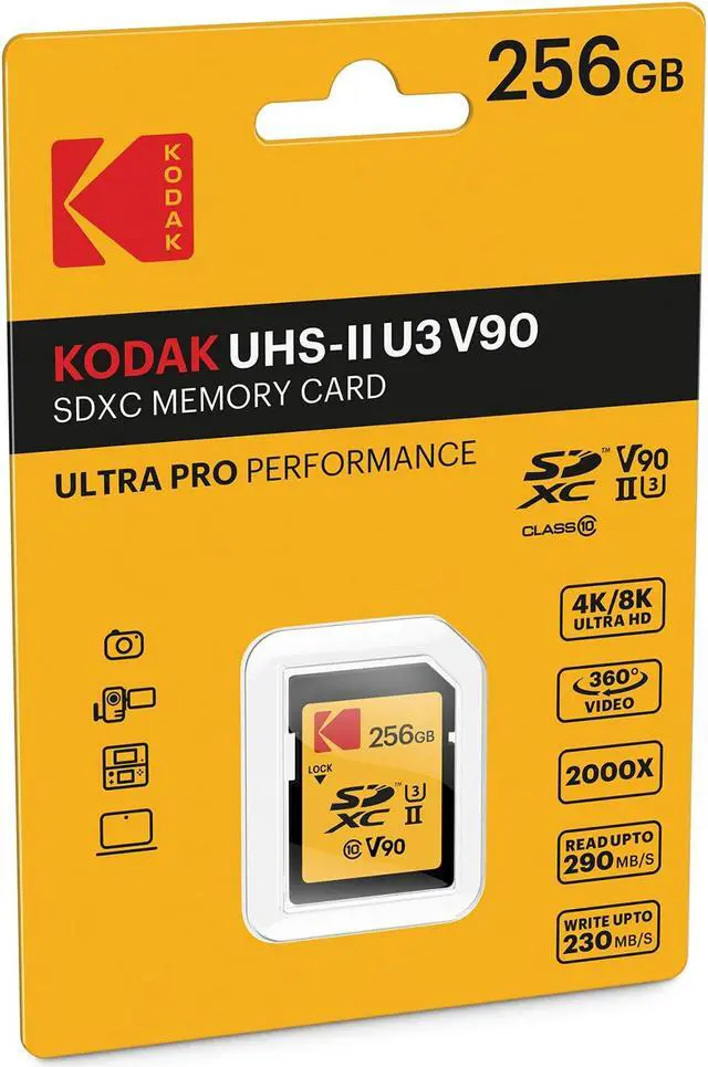 Ideal for all your needs: For 4K Ultra HD video recording and high speed continuous shooting the Kodak UHS-II U3 V90 SDXC Memory Card offers a 256GB storage capacity for all your needs