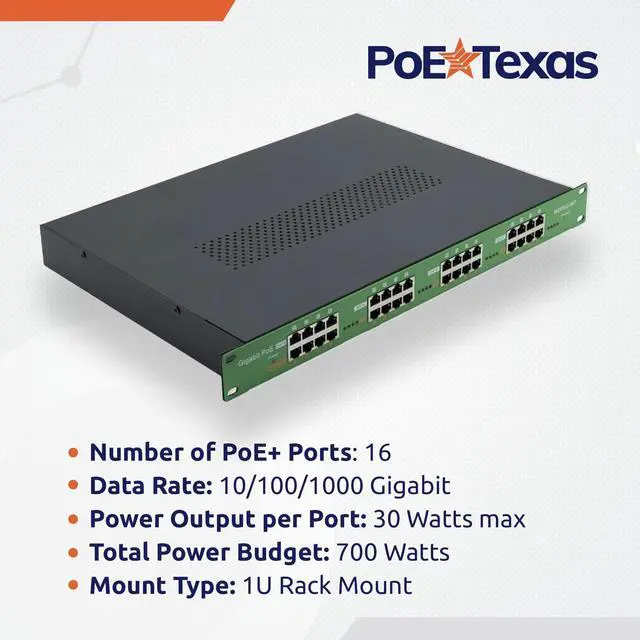 PoE Texas 16 Multi Port IEEE 802.3at PoE+ Injector - Get Full PoE+ On Every Port - Total 700 Watt Power - 10/100/1000 Gigabit Data - Active PoE+ Injector for WiFi Access Points, PTZ Cameras, IP Phones