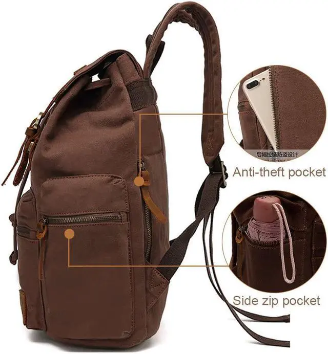 HIGH QUALITY MATERIALS: Our leather backpack made with premium quality enduring canvas fabric and genuine leather, features a classic yet stylish button closure flap over design, vintage brass hardware accents, adjustable shoulder strap, tighten and loosen easily.