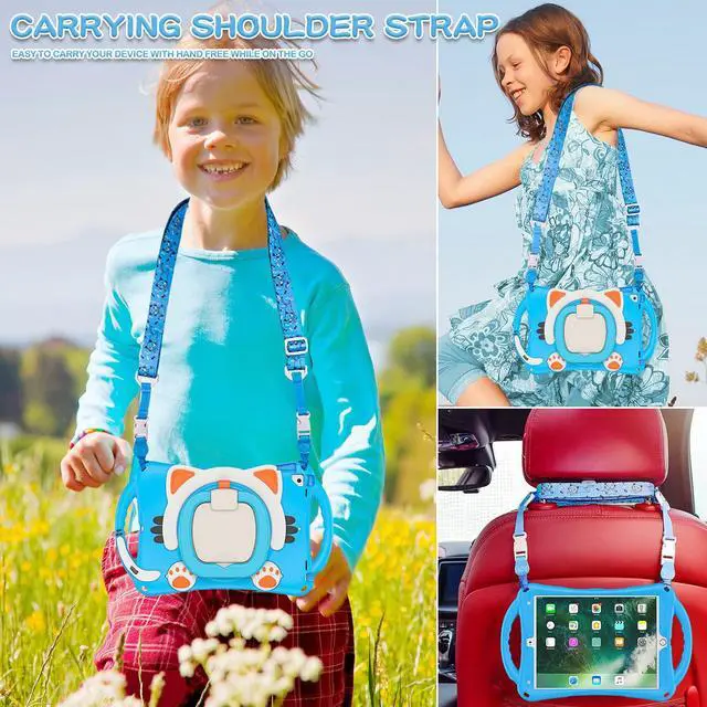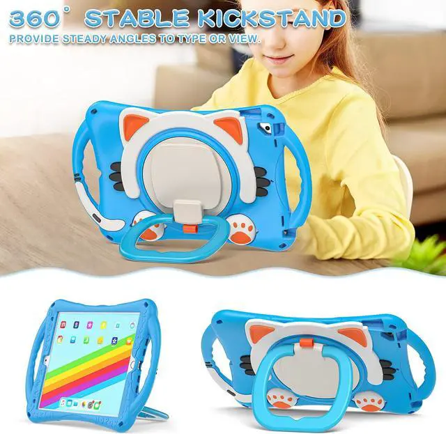 Full Body Protection: cute cartoon cat style appearance patent design while providing full body protection prevent from drops, shocks, bumps, scratches and dirt. No worry your iPad would slip out of your kids' hands and break. Full access to all ports, buttons and cameras without removing the case.