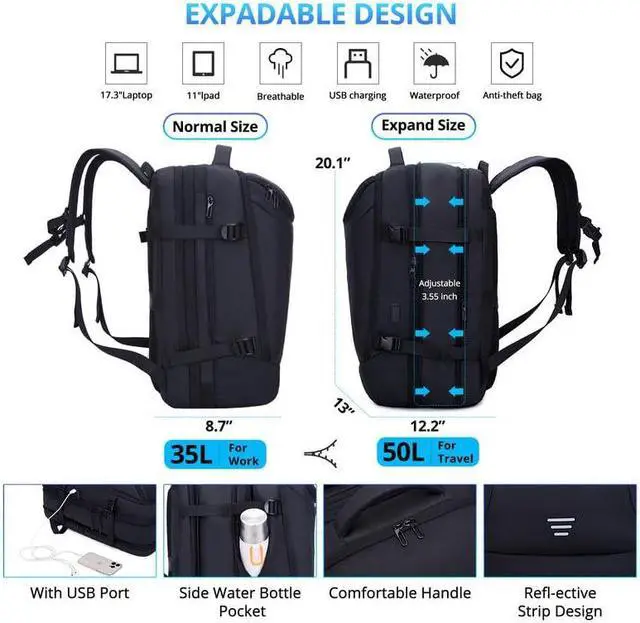 [35L-52L Expandable Travel Backpack]: One backpack has two large-size capacity designs to meet all your needs. The regular capacity is 35L, Size:20x13x8.7 inches. The expanded capacity is 52L,Size:20x13x12.2 inches. You can switch the required capacity according to your daily use.