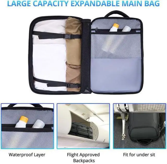 [Multiple compartments design]: The expandable travel backpack has 5 compartments, namely: 1. Shoe compartment, 2. Travel necessities storage compartment, 3. Clothes compartment that can accommodate 5-7 days, 4. IPAD and 17.3-inch laptop compartment. 5. Hidden pocket compartment on the back.
