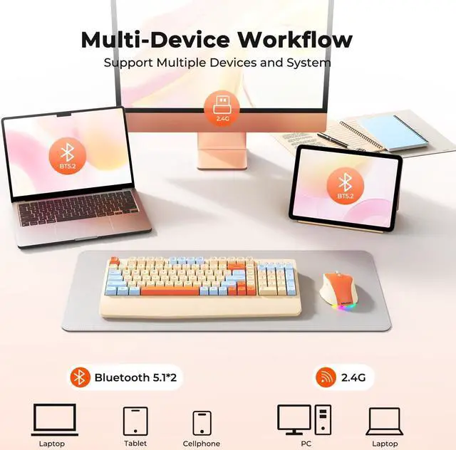 [(MULTI-DEVICE CONNECTION)] The C4000 Colorful Keyboard and Mouse offers two connectivity options, including BT5.2 and 2.4GHz wireless modes. It can connect up to three devices at the same time and can be easily switched with the three mode keys. Connectivity is unlimited for work, play and study.