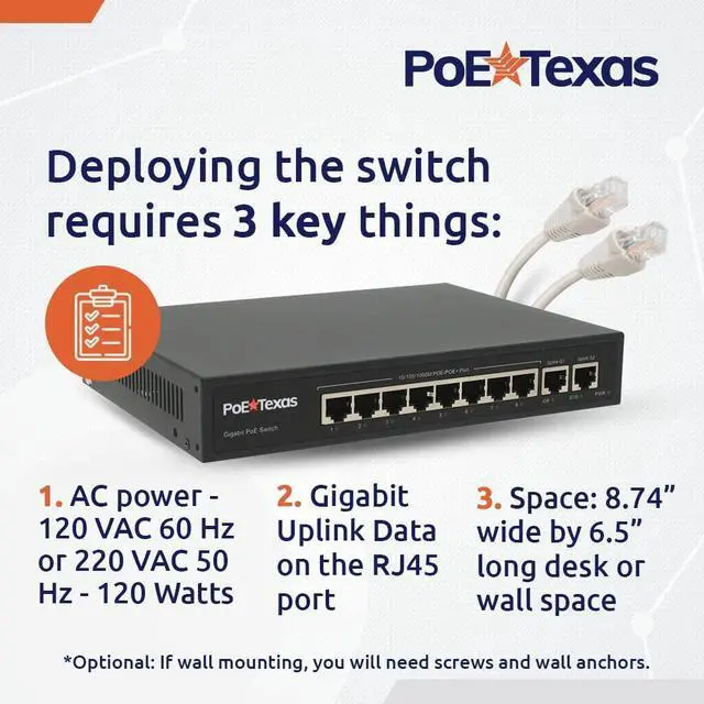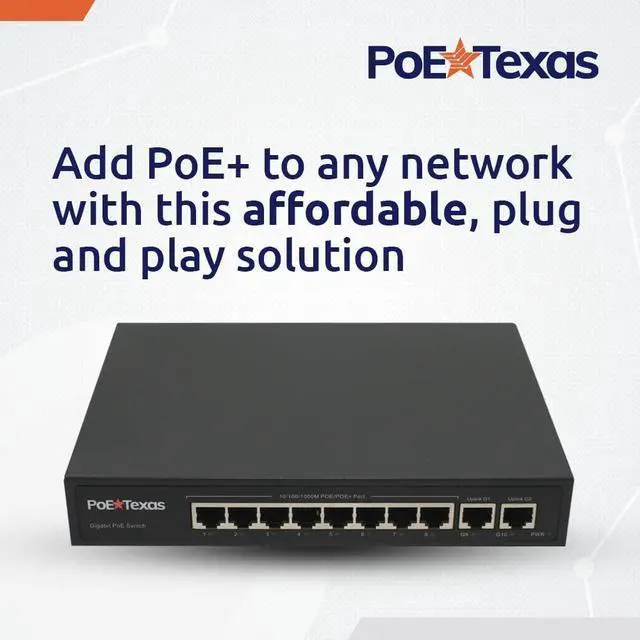 PoE Texas 8 Port PoE Switch - 802.3af/at Power Over Ethernet with 8 PoE+ Ports, 2 LAN Uplink, VLAN & Extender - 120W High Speed Unmanaged Wired Network Switch - Security Camera, Video & More