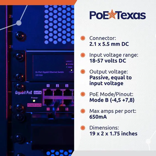 PoE Texas 24 Port PoE Injector - Multi-Port PoE Gigabit Rack Mount Midspan for IP Cameras, WiFi AP, Add Power Over Ethernet to Non-PoE Switch or Network Router for Ubiquiti and Mikrotik Devices
