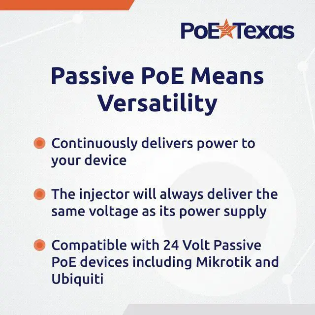 With this passive PoE Injector, you can add power to your data cable for a fraction of the cost of upgrading to a 24 volt Passive PoE capable network switch. Passive PoE power is Always On with power delivery on Mode B pins (-4,5 +7,8).