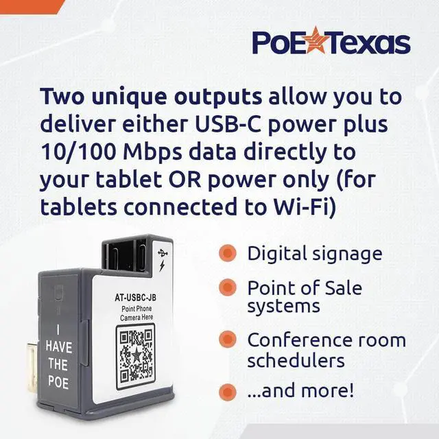 AT-USBC-JB: Delivers 22 watts of continuous USB-C power and 10/100 Fast Ethernet Data on one cable to your USB-C compatible devices OR deliver power only to USB-C devices connected to a wifi network. Two outputs offer greater flexibility & customization for your set up. Ideal for use as digital signage, Point of Sale, conference room schedulers, and more. Extends power to compatible devices up to 328 feet away from the source. Wired 10/100 Mbps data through the connector allows for greater network security. With 2.0 USB Data Standard Output (95mb/second). This in-wall device fits inside the standard US and European Junction Box for mounted tablet enclosures. Hassle-free plug-and-play design makes installation easy. Compatible with Vidabox, Heckler, Smart-Things, Viveroo, ArmorActive, Compulock, and more. Compatible with Apple Pro, Air, & Mini Tablets, Google Pixel, Surface Go, Surface Pro, Samsung Tab A, Samsung Tab S, Samsung Galaxy, Amazon Fire, and more. Kitted with a USB-C to USB-C cable.