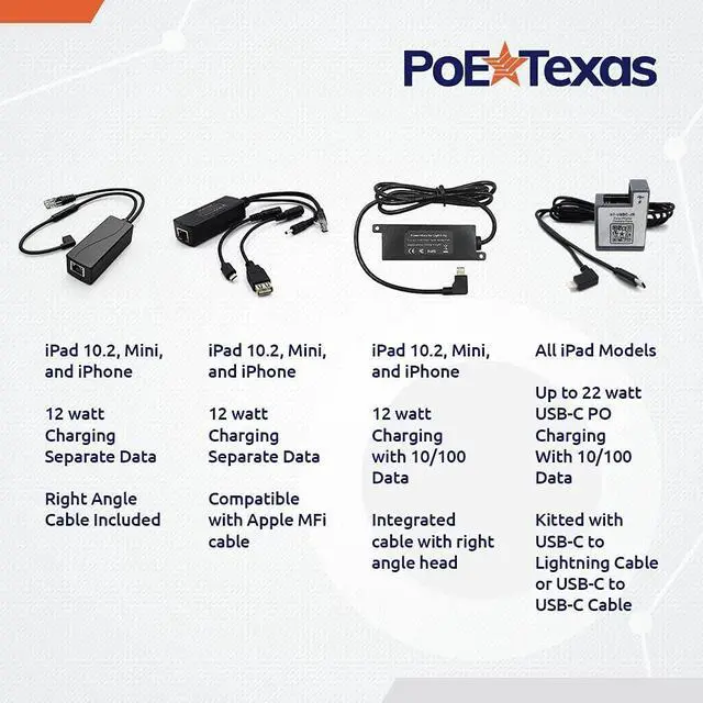 What Does This Do? This adapter delivers both 12 Watt power and Fast Ethernet data (100 Mbps) through a single cable to your iPad or iPhone - no separate power supplies or Wi-Fi needed. Works with iPad 10.2, iPad Mini, and iPhone models with Lightning connectors ^^ How Much Power Does an iPad Need? iPads and iPhones require 5 volt 12 watts to maintain power and provide Fast Ethernet connectivity. An IEEE 802.3 af PoE switch or injector (sold separately) will make this solution plug-and-play with no configuration needed. ^^ Is It Safe and Reliable? This PoE adapter is designed for continuous operation in conference rooms, POS stations, and kiosks.