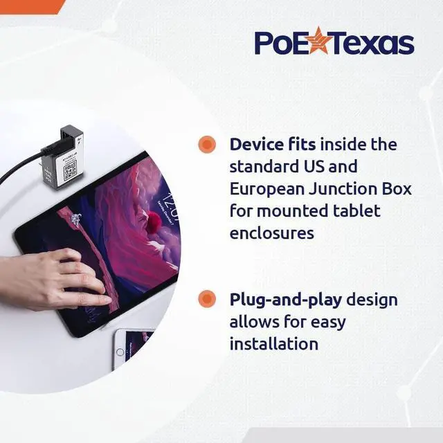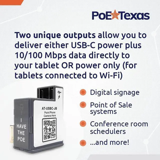 AT-USBC-JB: Delivers 22 watts of continuous USB-C power and 10/100 Fast Ethernet Data on one cable to your USB-C compatible devices OR deliver power only to USB-C devices connected to a wifi network. Two outputs offer greater flexibility & customization for your set up. Ideal for use as digital signage, Point of Sale, conference room schedulers, and more. Extends power to compatible devices up to 328 feet away from the source. Wired 10/100 Mbps data through the connector allows for greater network security. With 2.0 USB Data Standard Output (95mb/second). This in-wall device fits inside the standard US and European Junction Box for mounted tablet enclosures. Hassle-free plug-and-play design makes installation easy. Compatible with Vidabox, Heckler, Smart-Things, Viveroo, ArmorActive, Compulock, and more. Compatible with Apple Pro, Air, & Mini Tablets, Google Pixel, Surface Go, Surface Pro, Samsung Tab A, Samsung Tab S, Samsung Galaxy, Fire, and more. Kitted with a USB-C to USB-C cable.