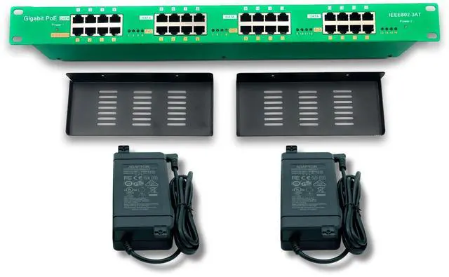 ^^ Power with Protection: Includes two 56 volt 120 watt supplies (240W total) and power supply mounting trays for a cleaner installation. This PoE injector allows you to distribute power across multiple devices with self-resetting fuses per port for continuous operation assurance and built-in overload protection.