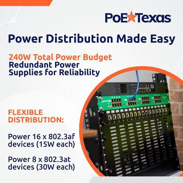 Cost-Effective Network Expansion: Add Power over Ethernet capability to any non-PoE or PoE only switch without replacing existing infrastructure. Delivers up to 30W per port ( 802.3 at/PoE+) with intelligent power distribution across a 240W total budget from redundant power supplies for powering WiFi access points, security cameras, VoIP phones and more.