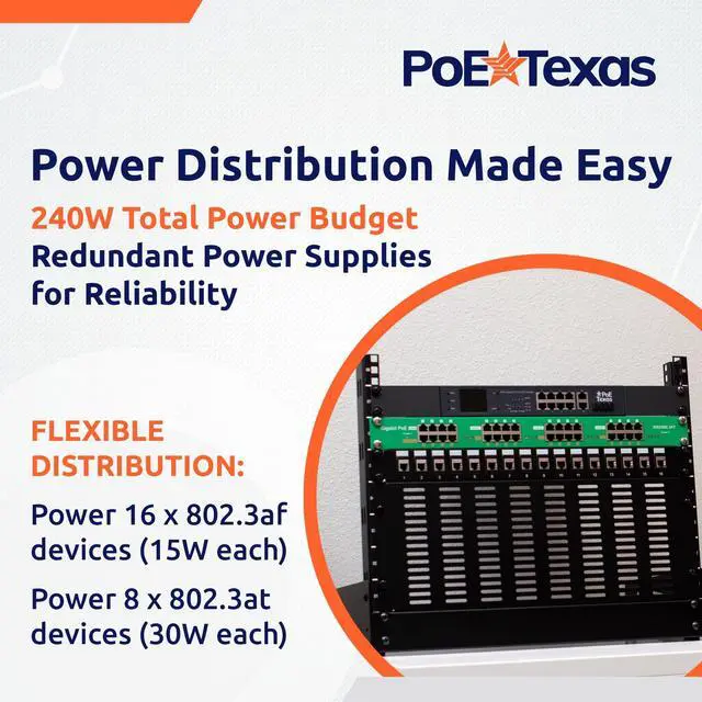 Cost-Effective Network Expansion: Add Power over Ethernet capability to any non-PoE or PoE only switch without replacing existing infrastructure. Delivers up to 30W per port ( 802.3 at/PoE+) with intelligent power distribution across a 240W total budget from redundant power supplies for powering WiFi access points, security cameras, VoIP phones and more.